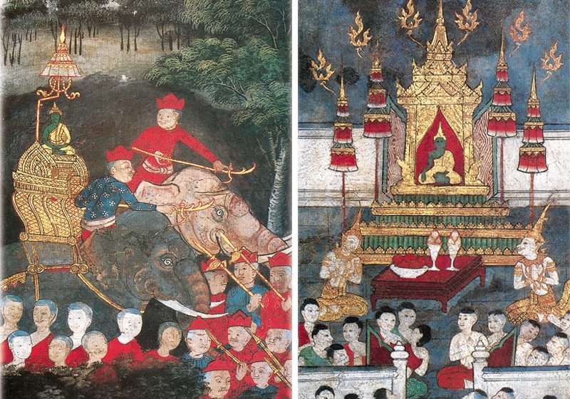 (Left) The Emerald Buddha being transported on an elephant from Chiang Rai to Chiang Mai (Mural painting at Wat Hong Rattanaram (วัดหงส์รัตนาราม)). (Right) King Anuruddha requesting the Emerald Buddha from the King of Lanka (Mural painting at Wat Hong Rattanaram (วัดหงส์รัตนาราม)).