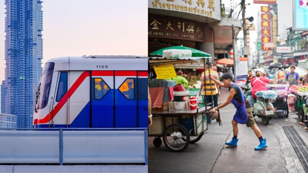 (Left) The elevated flow of the BTS Skytrain; (Right) The grounded agility of a street vendor’s cart. Two sides of Bangkok’s modern mobility and retail landscape.
