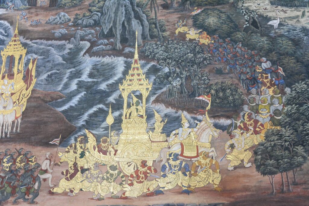 The Ramakien also functions as a model myth for Thai social and political structures. It has influenced the monarchy, particularly through the adoption of the name “Rama” from ancient rulers such as Phra Ramathibodi (1351-1369) and Phra Ramesuan (1339-1395) to the modern Chakri dynasty, where each king has borne the name Rama (e.g., Rama I to Rama X), linking the monarchy to divine legitimacy through Vishnu’s incarnation.