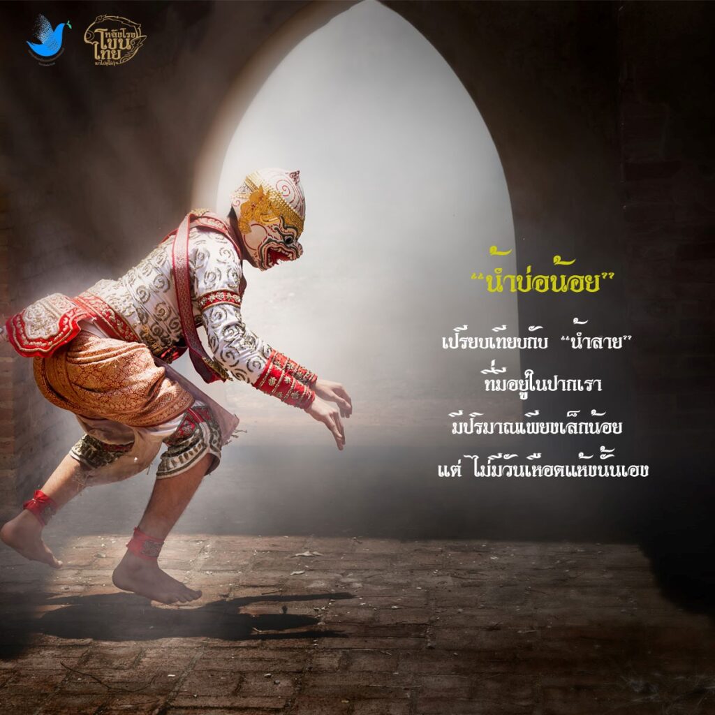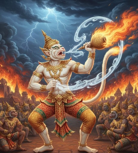 - Tiny well (น้ำบ่อน้อย – nam bo noi): When Hanuman set Thotsakan’s city ablaze, the tip of his tail also caught fire. Unable to extinguish it, he sought advice from a hermit who suggested using “the water from a tiny well.” Hanuman interpreted this to mean his own saliva. By placing the tip of his tail in his mouth, the fire was extinguished. This expression now implies that tactful words can resolve difficult problems.