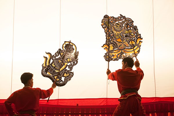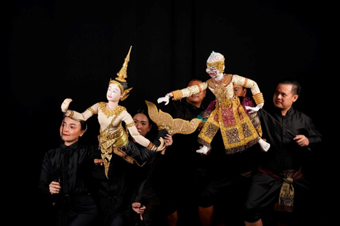 Traditional Thai puppetry is another genre of performance art that has been influenced by Ramakien. On some occasions, performances feature a creative blend of a playful “battle” between a shadow puppeteer, a string puppeteer, and a Khon dancer. Although puppetry shares similarities with Khon in terms of movement, singing, and narrative structure, especially when portraying episodes from the Ramakien, it differs in tone and interaction. Puppetry tends to be more relaxing and entertaining, incorporating direct audience engagement, offering a more accessible and dynamic experience compared to the formal style of Khon.