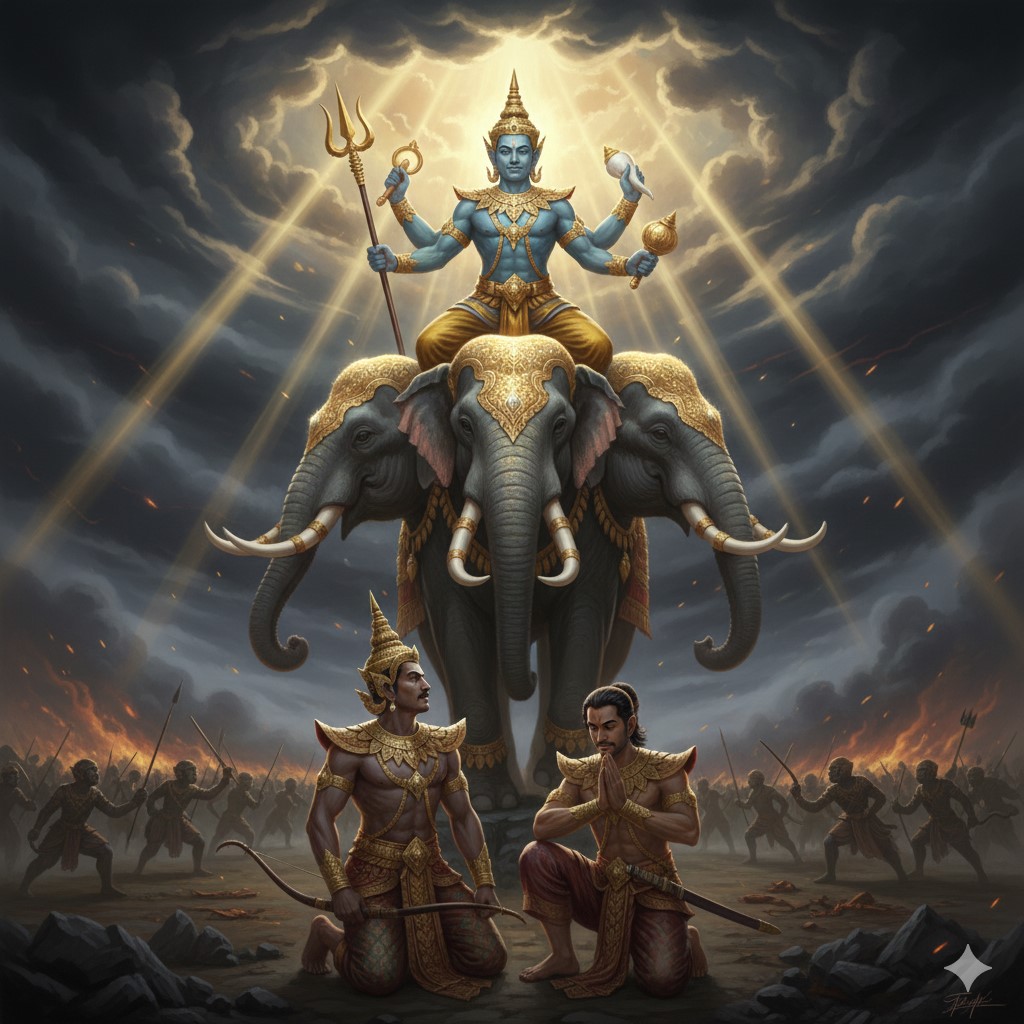 - Lord Indra descending from heaven five times to help Phra Ram overcome difficulties;