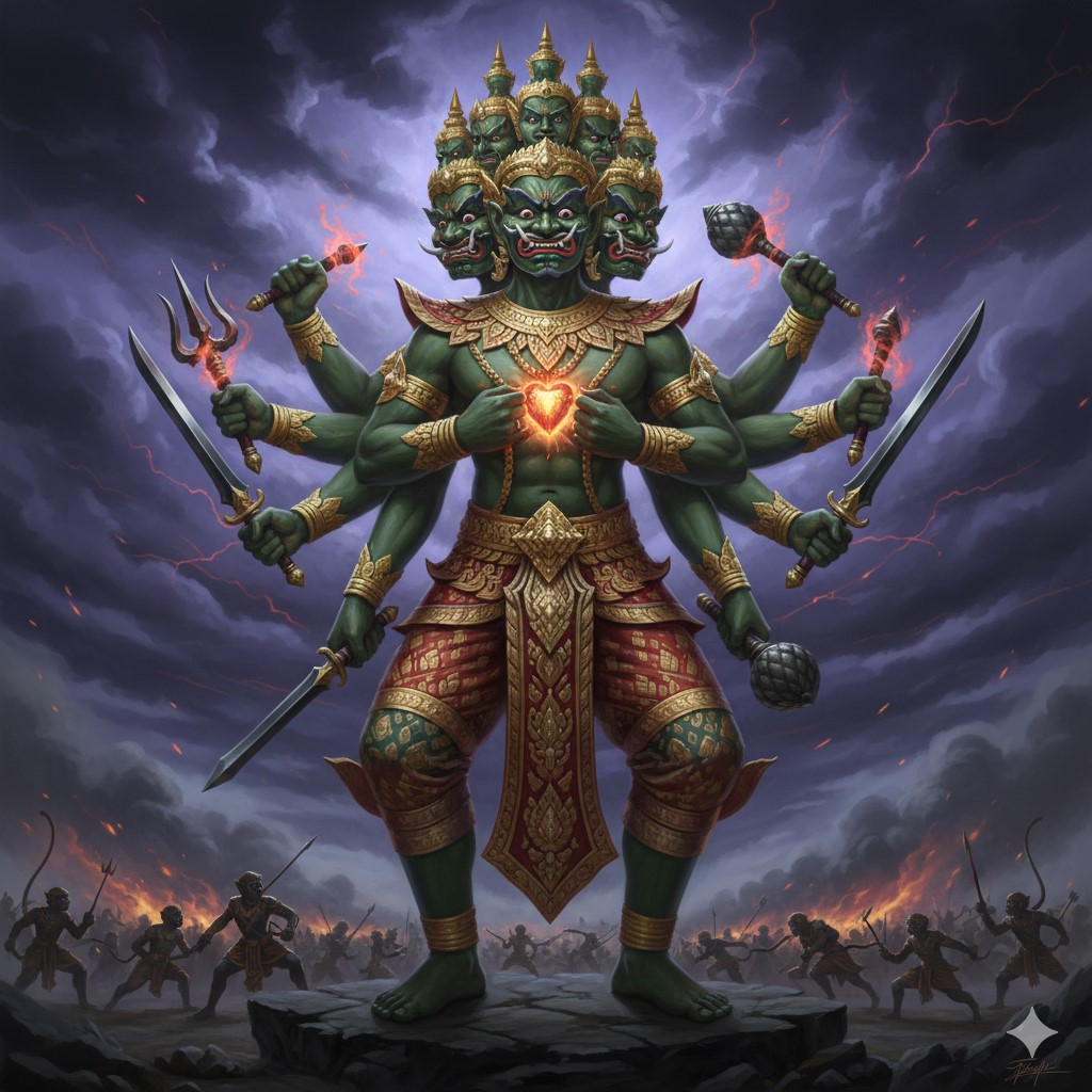 - Heart box (กล่องดวงใจ – klong duang jai): Thotsakan has removed his heart, hiding it in a box, rendering him immune to harm. In Thai, the phrase “heart box” has come to symbolize anything a person treasures dearly, something as valuable as life itself, requiring great protection and care.