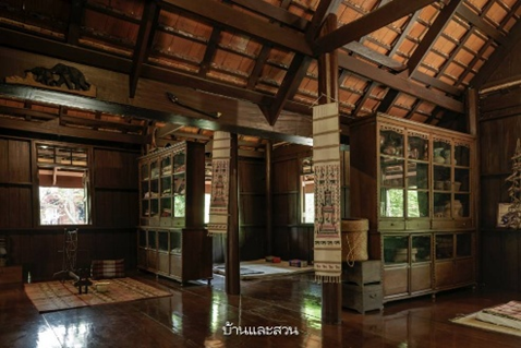 • Cluster house (Ruean Mu): A compound of multiple buildings connected by a shared Chaan. This includes the parents’ main house and separate sleeping houses for married children. In wealthy households, a grander layout was preferred. In addition to bedrooms, such compounds included a central hall as a lounge, a bird veranda for keeping birds, and a prayer room for enshrining Buddha images. The construction of a cluster house requires the Khrueang Sab technique which securely joins different pieces of hardwood without the need for nails and allows for convenient disassembly and reassembly.