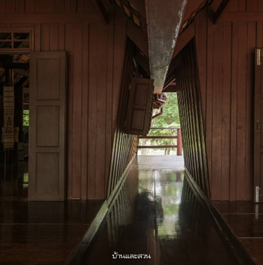 Traditional Thai houses stand on stilts at least two meters above the ground. The shaded underfloor called tai thun (ใต้ถุน) becomes a versatile space since it is cool enough for daily living in the hot season and practical for storing farming tools, weaving materials or simply resting. Movable stairs are placed outside the main structure so they can be lifted and secured at night. Extending from the upper floor is the veranda called chaan, often covered with a roof and used as a lounge or open-air kitchen where wooden planks are laid about one centimeter apart to allow rainwater to drain through.