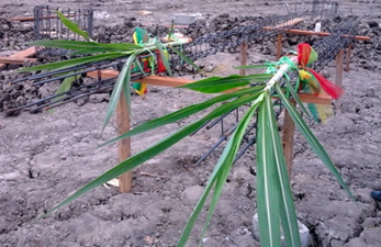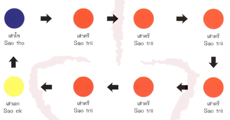Auspicious timing is essential when setting a house’s main pillars. Traditional Thai houses typically have eight pillars, arranged in a vertical rectangle. The first pillar, set at the lower left corner, is the main pillar or sao ek (เสาเอก), and its placement must follow strict astrological calculations. The remaining pillars are then set in clockwise order, with the second pillar known as sao tho (เสาโท) and the rest are sao tri (เสาตรี).