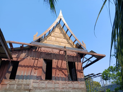 • Gable or Melayu is known locally as Mae Lae (แมและ). This gable roof shows influence from Central Thai houses but differs in its winged windbreak, reflecting Malaysian design traditions.