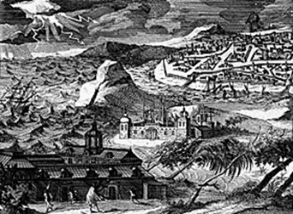 Ayutthaya struck by thunderstorm, 1707, Representation of the Dutch lodge in left corner.