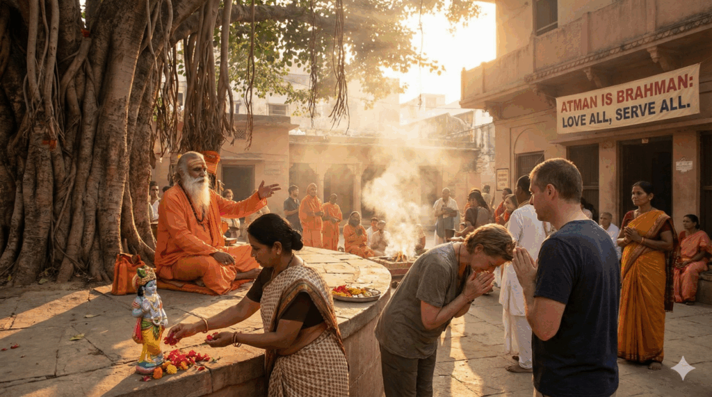 ทั่วทั้งอนุทวีปอินเดีย ประเพณีอันหลากหลายของศาสนาฮินดูได้นำเสนอรากฐานทางอภิปรัชญาสำหรับความรักสากล ซึ่งสอดคล้องอย่างลึกซึ้งกับแนวคิดทางพระพุทธศาสนา หัวใจสำคัญของปรัชญาฮินดูสำนักเวทานตะคือแนวคิดที่ว่า ตัวตนที่แท้จริง (อาตมัน - Atman) นั้นเป็นสิ่งเดียวกับความจริงสูงสุดของจักรวาล (พรหมมัน - Brahman) ดังนั้น เส้นแบ่งระหว่าง "ตัวฉัน" และ "ผู้อื่น" จึงเป็นเพียงม่านแห่งมายาคติ (Maya) การทำร้ายผู้อื่นจึงเท่ากับเป็นการทำร้ายตนเอง และการรักผู้อื่นคือการตระหนักถึงประกายแห่งพระเจ้าองค์เดียวกับที่สถิตอยู่ในตัวเรา