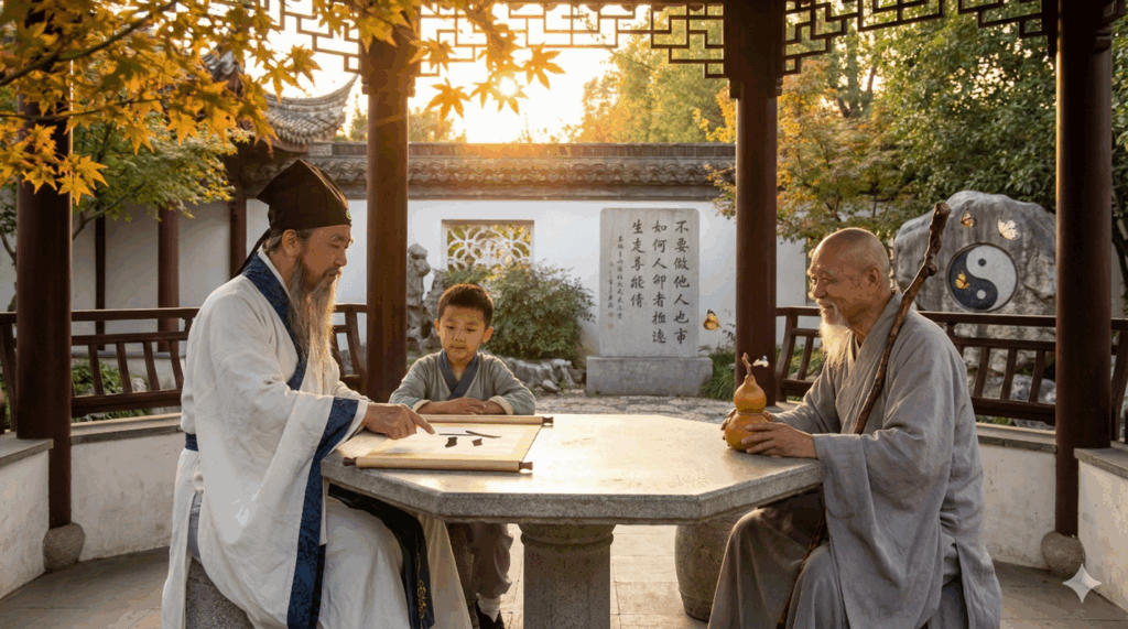 ส่วนมุมมองของลัทธิเต๋า ซึ่งเข้ามาเติมเต็มแนวคิดนี้ มองความรักว่าเป็นการสอดคล้องกับ "เต๋า" (The Way) เล่าจื๊อสอนว่าจักรวาลดำเนินไปตามหลักการของการให้โดยไม่หวังผล ในคัมภีร์ "เต้าเต๋อจิง" ท่านเขียนว่าปราชญ์ผู้รู้แจ้ง "ถือเอาใจของประชาชนเป็นใจของตน" แสดงออกซึ่ง "ฉือ" (Ci - ความเมตตา) คือ ความรักที่สงบเย็น ไม่แสวงหาการควบคุมหรือครอบครอง แต่ปล่อยให้ผู้อื่นเจริญงอกงามตามธรรมชาติของตน เมื่อรวมกัน ประเพณีเหล่านี้ชี้ให้เห็นว่าความรักคือกาวที่ประสานความกลมเกลียว เชื่อมโยงปัจเจกบุคคลเข้ากับครอบครัว สังคม และจักรวาล
