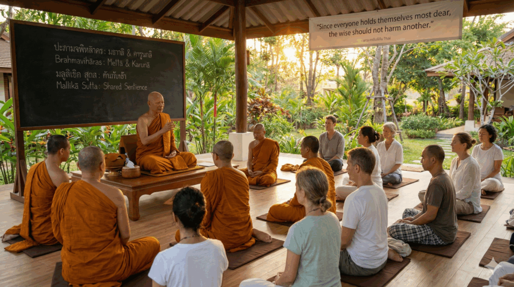 สิ่งที่สำคัญคือคำสอนทางพระพุทธศาสนาได้วางรากฐานอุดมคตินี้ไว้บนความเป็นจริงทางจิตวิทยา ใน "มัลลิกาสูตร" พระนางมัลลิกาทูลตอบพระเจ้าปเสนทิโกศลตามความสัตย์จริงว่า ไม่มีผู้ใดที่เป็นที่รักของพระนางยิ่งไปกว่าตัวพระนางเอง แทนที่จะตำหนิว่าเป็นความหลงตัวเอง พระพุทธองค์ทรงใช้ความจริงนี้เป็นสะพานสู่ความเข้าอกเข้าใจผู้อื่น (Empathy) พระองค์ตรัสว่า ในเมื่อทุกชีวิตต่างรักตนเองที่สุดเช่นกัน ผู้ที่รักตนเองอย่างแท้จริงจึงไม่ควรเบียดเบียนผู้อื่น ณ จุดนี้ "กฎทอง" (Golden Rule) ไม่ใช่คำสั่งจากสวรรค์ แต่เป็นข้อสรุปเชิงตรรกะที่เกิดจากการมีสภาวะรับรู้ความรู้สึกเหมือนกัน (Shared sentience) การเข้าใจความปรารถนาในความสุขและความเกลียดกลัวความทุกข์ของตนเอง จะช่วยปลดล็อกศักยภาพของ "กรุณา" (Karuna) คือ อาการที่ใจหวั่นไหวเมื่อเห็นผู้อื่นเป็นทุกข์ ในวัฒนธรรมไทย การมองเห็นตนเองในผู้อื่นเช่นนี้ คือรากฐานของความกลมเกลียวทางสังคม