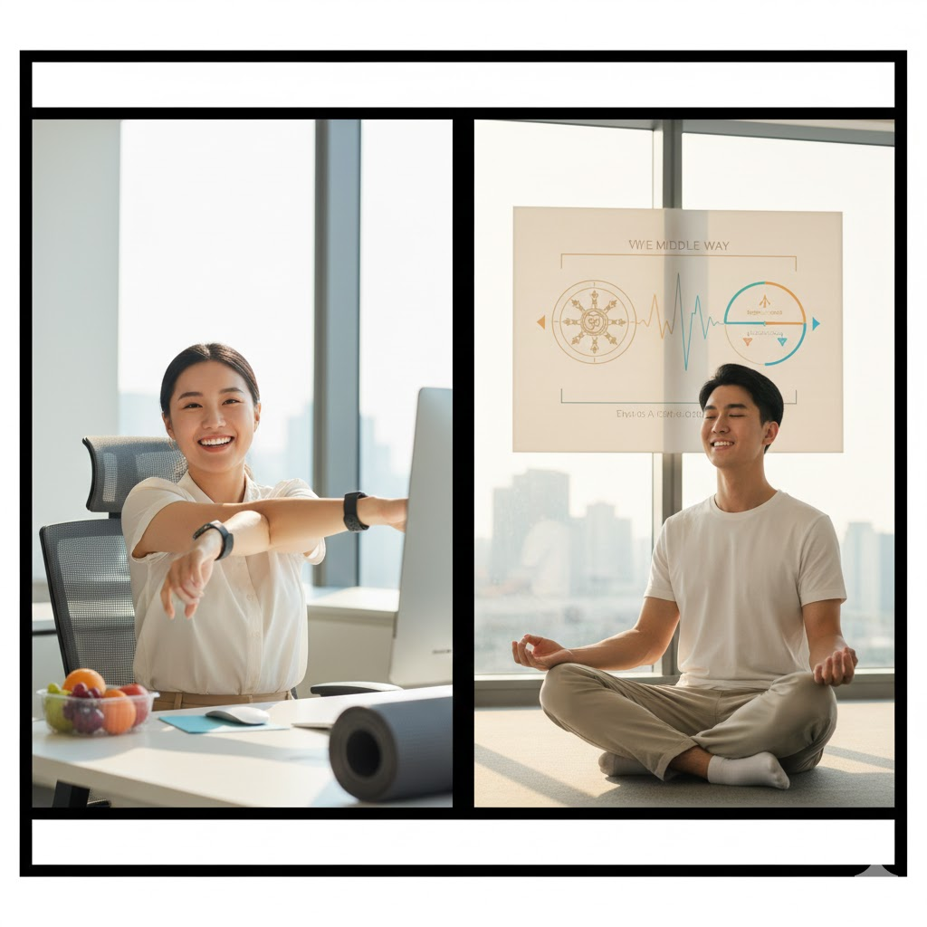 ทางสายกลางและสัมมาวายามะ (ความเพียรชอบ): ภาวะหมดไฟคือผลลัพธ์ที่หลีกเลี่ยงไม่ได้ของความพยายามที่ตึงเครียดเกินไป เปรียบเสมือนสายพิณที่ขาดเพราะขึงตึงจนเกินไป คำสอนของพระพุทธเจ้าเรื่อง เรื่อง "มัชฌิมาปฏิปทา" (ทางสายกลาง) แนะนำให้หลีกเลี่ยงความสุดโต่งของการทรมานตนเองและการหมกมุ่นในความสุขทางโลก และในบริบทของการทำงาน คือการหลีกเลี่ยงทั้งการบ้างาน (ตึงเกินไป) และความเกียจคร้านเรื้อรัง (หย่อนเกินไป) หลักการนี้ตกผลึกอยู่ในองค์ประกอบของ "สัมมาวายามะ" (ส่วนหนึ่งของมรรคมีองค์แปด) ซึ่งกำหนดโดยความพยายามอย่างมีสติสี่ประการ (ปธาน 4):