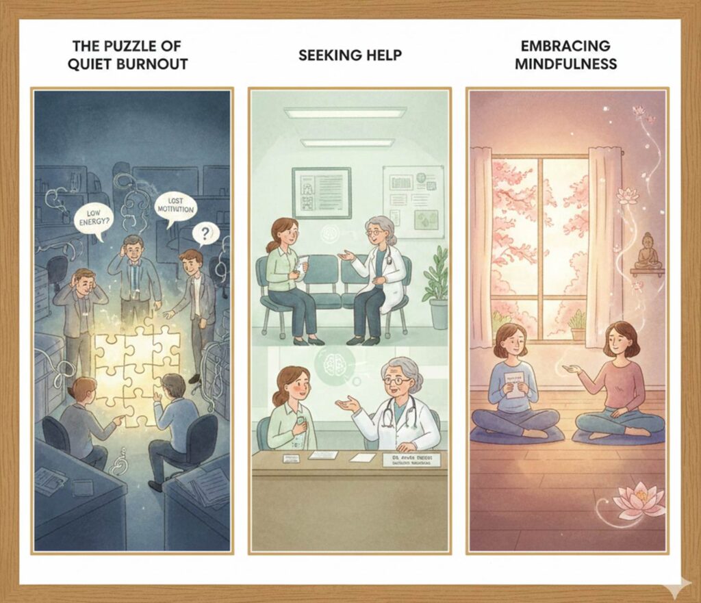 ในโรงละครแห่งการทำงานยุคใหม่ที่ดำเนินไปอย่างไม่หยุดหย่อน ซึ่ง "ความยุ่งเหยิง" มักถูกเข้าใจผิดว่าเป็นคุณธรรม รูปแบบความทุกข์ทรมานในที่ทำงานที่แพร่หลายและซ่อนเร้นกำลังก่อตัวขึ้น นั่นคือ ภาวะหมดไฟเงียบ (Quiet Burnout)ซึ่งต่างจากภาวะหมดไฟแบบรุนแรงที่มักแสดงออกด้วยการล้มพับอย่างชัดเจน ภาวะหมดไฟเงียบจะค่อย ๆ คืบคลานเข้ามา โดยแฝงตัวอยู่ในรูปของความเหนื่อยล้าธรรมดาหรือ "ความหงุดหงิด" ที่เกิดขึ้นอย่างต่อเนื่อง มันคือการสูญเสียพลังใจไปอย่างช้า ๆ และเงียบเชียบ ซึ่งมักเกิดขึ้นกับผู้ที่ยังคงพยายามรักษาภาพลักษณ์ของการทำงานที่มีประสิทธิภาพสูงไว้ให้ได้ ในขณะที่ทรัพยากรภายในของตนเอง ทั้งอารมณ์ จิตใจ และร่างกาย กำลังร่อยหรอจนแทบไม่เหลือพลัง บทความนี้จะให้คำนิยามถึงธรรมชาติของโรคระบาดเงียบนี้ ระบุถึงสาเหตุที่หยั่งรากลึก สำรวจกลยุทธ์ทางการแพทย์เพื่อหลีกเลี่ยง และที่สำคัญกว่านั้นคือนำเสนอเส้นทางอันลึกซึ้งสู่ความสงบในจิตใจและความยืดหยุ่นที่ยั่งยืน โดยมีรากฐานมาจากภูมิปัญญาทางจิตวิญญาณอันไร้กาลเวลาและการปฏิบัติสมาธิในคำสอนของพระพุทธเจ้า การสำรวจข้อเท็จจริงนี้นำเสนอขึ้นเพื่อเป็นแหล่งที่มาของแรงบันดาลใจอันลึกซึ้งและแนวทางปฏิบัติ ไม่ได้มีจุดมุ่งหมายทางการแพทย์แต่อย่างใด