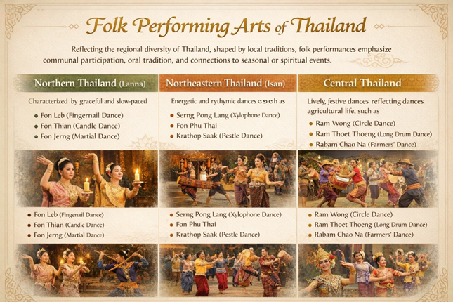 Folk performing arts reflect the regional diversity of Thailand, shaped by local traditions, languages, occupations, and spiritual beliefs. Unlike the highly codified classical forms, folk performances often emphasize communal participation, oral tradition, and connections to seasonal or spiritual events. Folk dances are typically grouped by regional culture:
