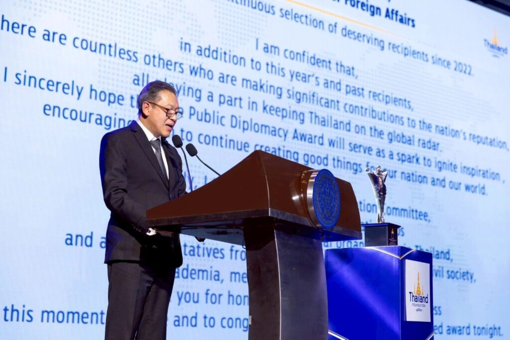 The Thailand’s Public Diplomacy Award was established in 2022 by the Ministry of Foreign Affairs and the Thailand Foundation to honor Thai and foreign individuals, groups, or organizations who have significantly contributed to the recognition of Thailand, Thai people, and Thainess on the international stage. Another objective was to support recipients in continuing their outstanding works and to inspire the general public to participate more actively in advancing Thai public diplomacy.
